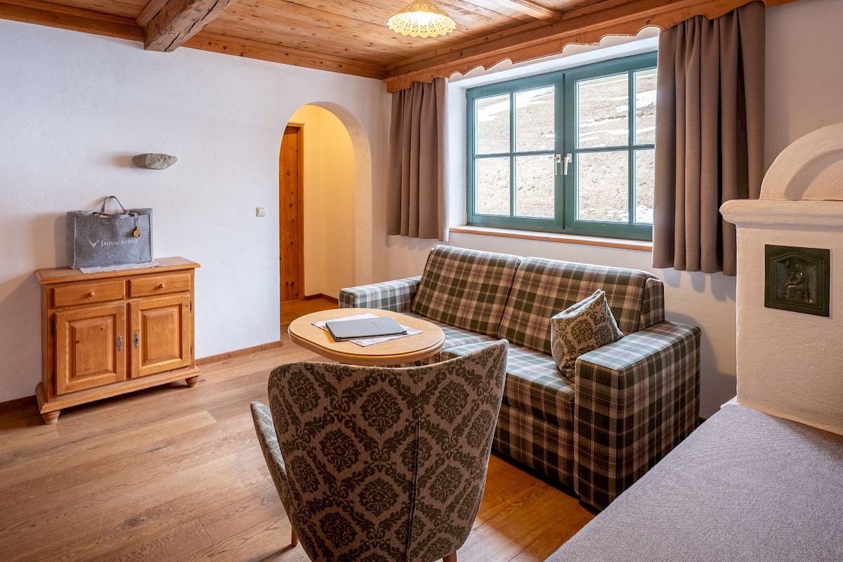 Die Kaisersuite Junior mit 60 m² und eigener Terrasse sowie Kachelofen für wahrlich kaiserlichen Genuss.