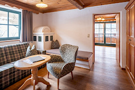 Das großzügige Studio im Turm des Jagdschlössls mit zwei getrennten Schlafzimmern und traditioneller Turm-Wohnstube.